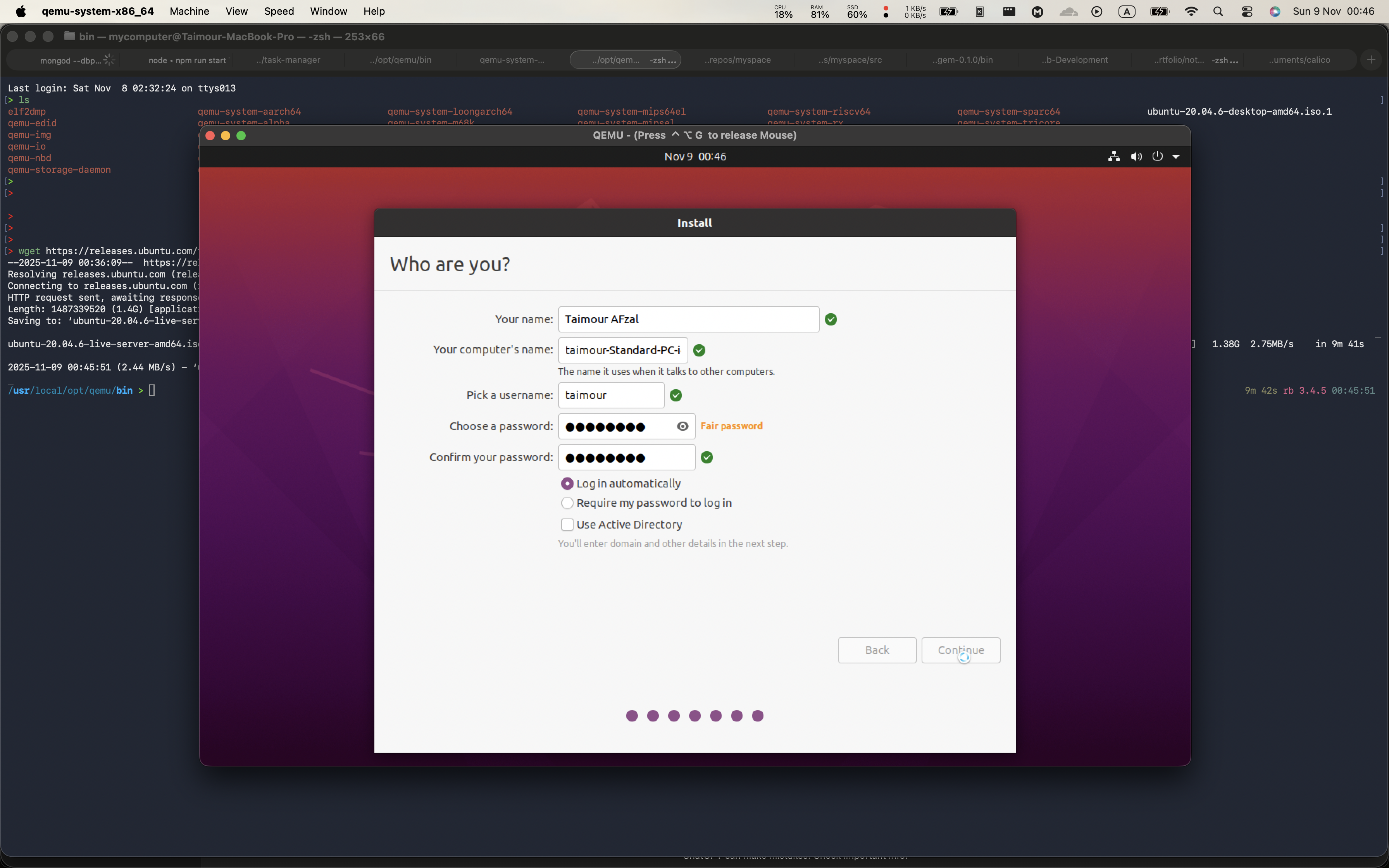 -drive file=ubuntu2004.qcow2,if=virtio-accel tcg: Use TCG (Tiny Code Generator) for software-based CPU emulation-smp 2: Allocate 2 CPU cores to the VM-m 4G: Allocate 4GB of RAM-boot d: Boot from CD-ROM (the ‘d’ stands for CD-ROM drive)-vga std: Use standard VGA graphics (most compatible)-cdrom ubuntu-20.04.6-desktop-amd64.iso: Mount the Ubuntu ISO as a CD-ROM-drive file=ubuntu2004.qcow2,if=virtio: Attach our virtual disk with VirtIO interface for better performance